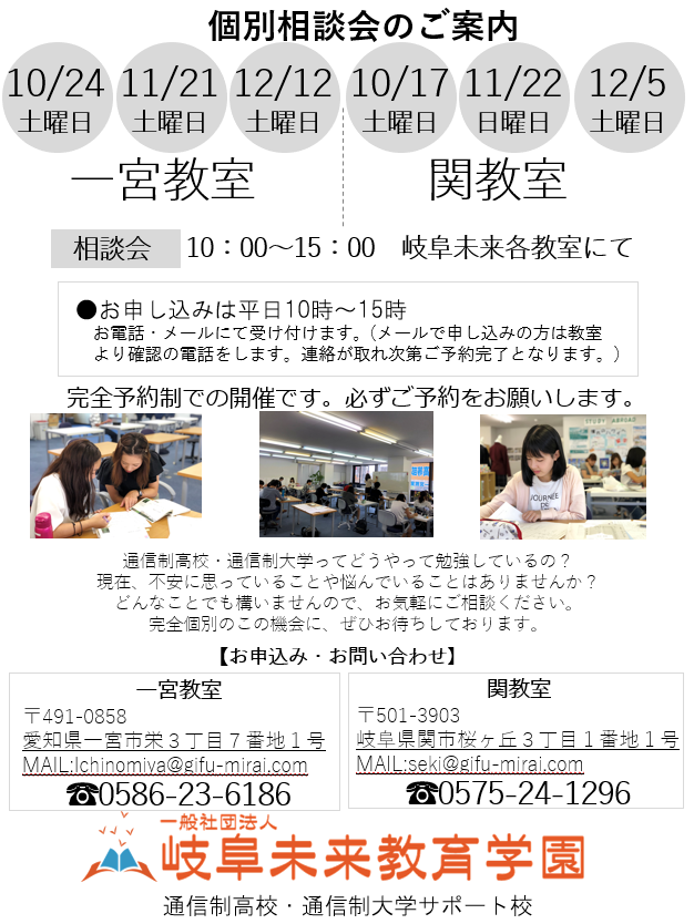 今年度も残り半分…今年度も折り返し時点を過ぎました!正直にお伝えすると、学習に取り組める時間はたくさんあります!とは言えません…しかし、今在籍している高校に登校できず、不安な毎日を過ごされている生徒の皆さん。岐阜未来の職員や生徒と共に、このタイミングで再スタートをして学年を落とさず高校卒業をめざしませんか?私達があなたの新しい再スタート、新しい環境で取り組むべき学習をサポートします。来年度からの新入学を希望している中学生の方、岐阜未来では一次募集が始まっています。各教室の定員が決まっています。是非、教室見学にお越し下さい!実際の教室の雰囲気を感じて欲しいので、相談や教室見学は平日をお勧めしていますが、土日希望の方々に向けた相談会の日時もご用意しました。予約制で受け付けておりますので、希望する教室までお申し込みください。