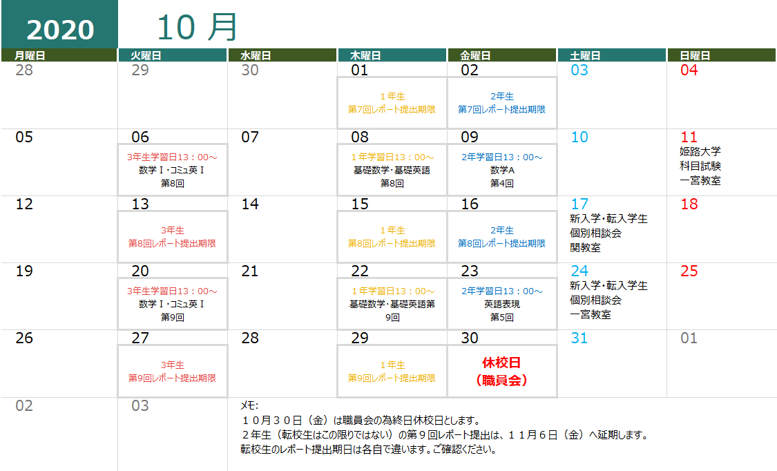 生徒・保護者用10月スケジュール表